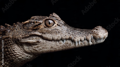 © jinna, Fototapeta premium Close-up profile of a crocodile's head with sharp teeth and textured skin against a black background
