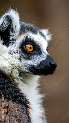 Fototapeta premium Close-up profile of a lemur with striking orange eyes against a soft, blurred brown background