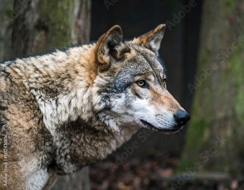 © Cuccok, Fototapeta premium Close-up profile of a wolf in a forest