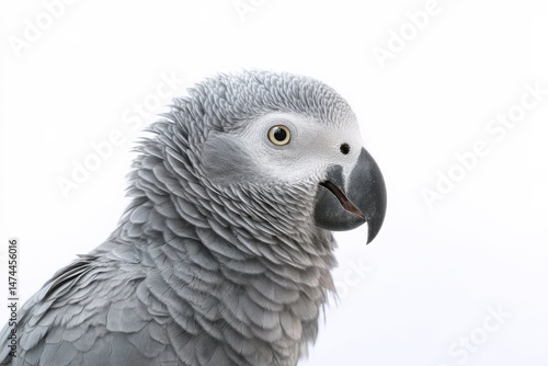 © AuraArt, Fototapeta premium Close-up profile of an African Grey Parrot against a bright white background.