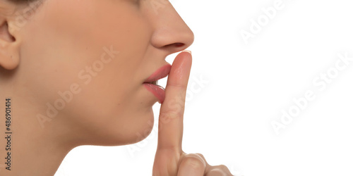 Obraz premium close up profile of young woman holding finger on lips on a white