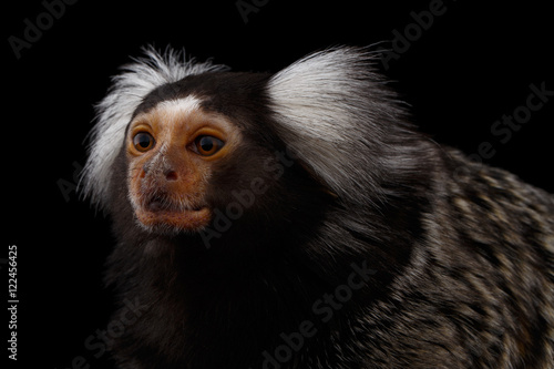 © seregraff, Naklejka premium Close-up Profile portrait of Cute monkey Common Marmoset, Callithrix jacchus Isolated Black background