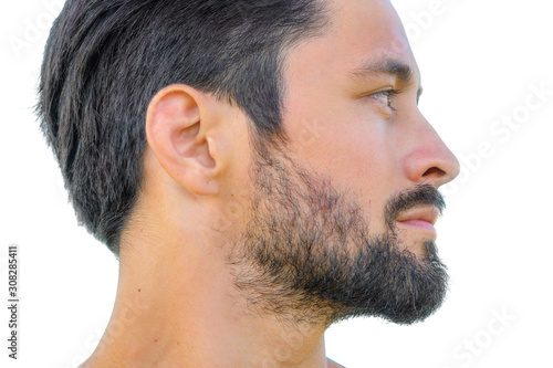 Obraz premium Close up profile portrait of healthy man with black hair, strong features,...