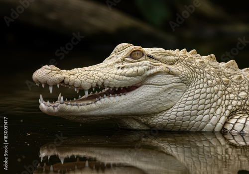 Obraz premium Close up profile shot of a large, rare, white alligator resting in shallow water, showing its powerful jaw and textured scales, swamp, beast, water