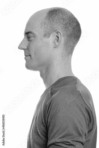Obraz premium Close up profile view of bald Caucasian man
