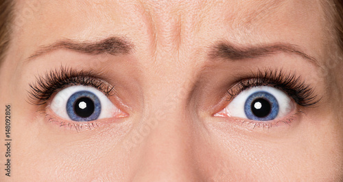 © DenisNata, Naklejka premium Close-up przerażona twarz pięknej młodej kobiety z pięknymi niebieskimi oczami i dużymi ładnymi rzęsami i brwiami. Makro oczu człowieka - zdziwienie lub szok, patrząc w kamerę.
