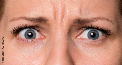 © DenisNata, Naklejka premium Close-up przestraszona twarz pięknej młodej kobiety o pięknych niebieskich oczach i dużych ładnych rzęsach i brwiach. Makro oczu ludzkich - zdziwienie lub szok, patrząc w kamerę.