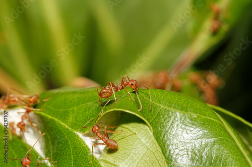 Fototapeta premium Close up red ant on green leaf in nature at thailand