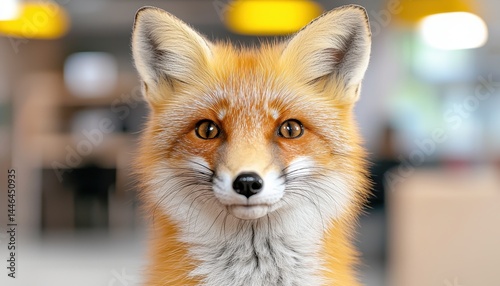 © siriwan, Obraz premium Close Up Red Fox Portrait Fluffy Fur Amber Eyes Blurred Background Indoor Setting