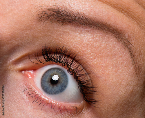 © DenisNata, Fototapeta premium Close-up scared face of beautiful young woman with beautiful grey eyes and big pretty eyelashes and eyebrows. Macro of human single eye - surprise or shock, looking away.