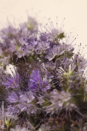 © Liliia, Naklejka premium Close-up selective soft focus lilac, beige small flower, pistil, stamen. Macro natural background.