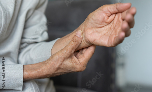 © chinnarach, Fototapeta premium close up senior woman massage on hand to relief pain from hard working for treatment about gout syndrome and chronic illness health care concept