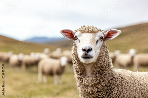 © TEERAPAT, Fototapeta premium Close up sheep face in large herd, looking straight ahead with curious expression