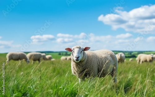 © Niks Ads, Fototapeta premium close up Sheep grazing on a lush green field,
