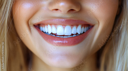 © Aliaksandra, Fototapeta premium Close-up shot of a cheerful woman’s smile showing perfect white teeth, highlighting dental health, beauty, and confidence