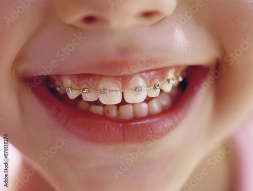 Fototapeta premium Close up shot of a child's teeth with metal braces, highlighting orthodontic...