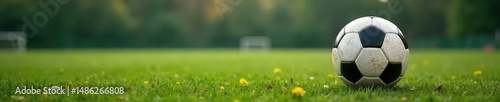 © Atittaya, Obraz premium Close-up shot of a classic black and white soccer ball resting on a worn, textured football field, conveying passion and the spirit of the game , classic, stadium