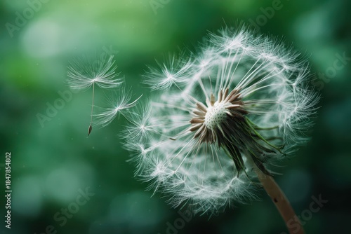 Fototapeta premium Close-up shot of a dandelion seed head kissed by wind, dreamy green background