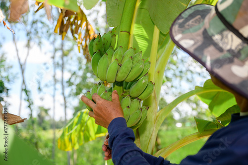 Fototapeta premium Close-up shot of a farmer inspecting green banana bunch on banana tree in...