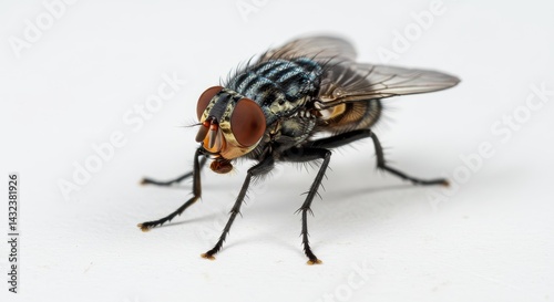 © Muaz, Fototapeta premium Close up shot of a fly with red eyes and striped body standing on a white surface looking forward