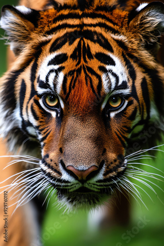 © Kasiwat, Fototapeta premium Close-up shot of a majestic tiger staring intensely with piercing eyes and vibrant stripes in a natural habitat.