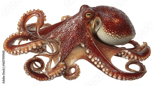 © Ramjan, Fototapeta premium Close up shot of a red octopus with curled tentacles and visible suckers against a white background space
