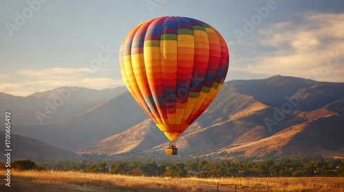 Fototapeta premium Close-up shot of a single vibrant hot air balloon rising into the sky,...