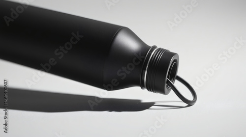 © Noradzen, Fototapeta premium Close-up shot of a sleek black water bottle with a minimalist design against a white background.