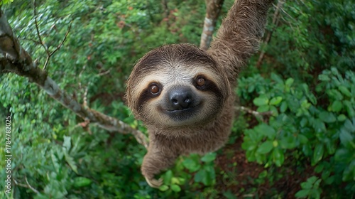 © Pasindu, Naklejka premium Close up shot of a sloth hanging from a tree branch surrounded by lush green foliage in nature