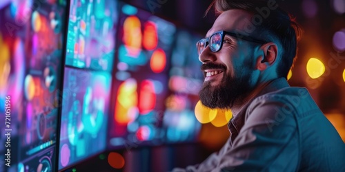© piai, Obraz premium Close up shot of a smiling creative digital marketer, surrounded by glowing screens displaying successful e-commerce campaigns