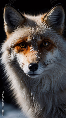 © SecretCanvas, Fototapeta premium Close up shot of a snow fox with snowflakes gently falling on its fur captured in professional winter photography against a dark background