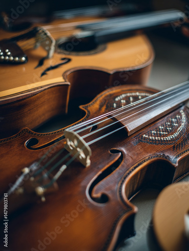 Fototapeta premium Close up shot of a violin and guitar musical instruments for music lovers and...