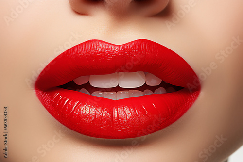 Obraz premium close up shot of a woman's lips wearing red bright lipstick