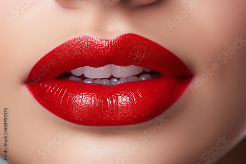 Obraz premium close up shot of a woman's lips wearing red bright lipstick