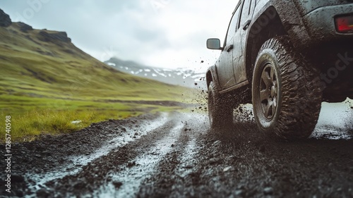 © Pixora Labs, Naklejka premium close-up shot of an all-terrain vehicle navigating through mud and water