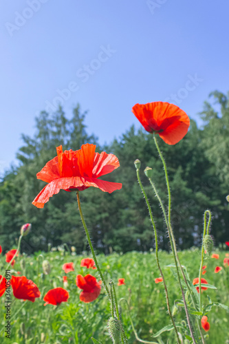 © Юлия Ненадовец, Obraz premium Close up shot of blooming poppies on bokeh background