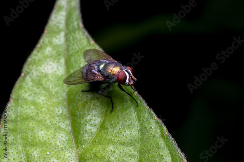© ZAIRIAZMAL, Naklejka premium close up shot of common house fly standing on green leaf