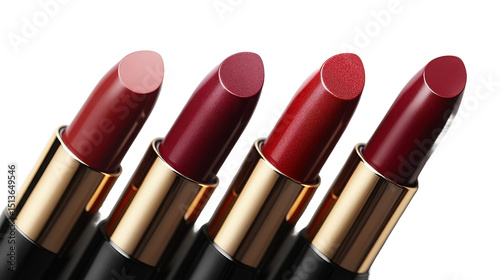 Obraz premium Close up shot of four lipstick tubes in varying shades of red on transparent...