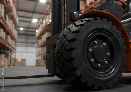 © SurrealAI, Fototapeta premium Close Up shot of Industrial Forklift Wheel in Warehouse with Pallet Racks and Cardboard Boxes