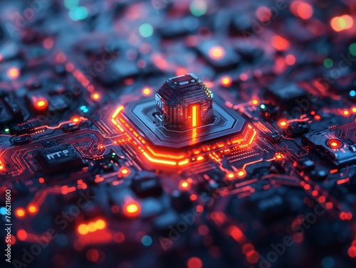 © CG Design, Fototapeta premium Close-up shot of motherboard with illuminated LED circuits