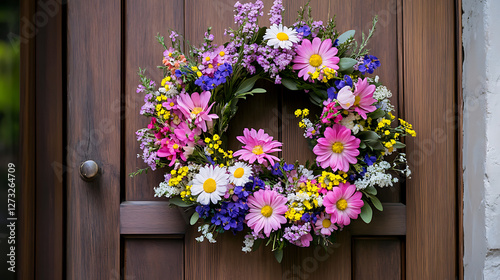 © sasisom, Naklejka premium Close Up Shot of Multicolored Floral Wreath Hanging on a Dark Brown Wooden Door