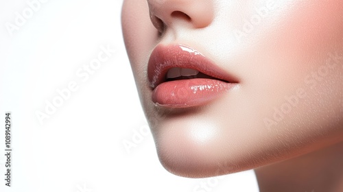 © Danudet.C, Fototapeta premium Close-Up Shot of Woman's Lips with Glossy Finish, Perfect Skin Tone, and Natural Makeup Look on Minimalist Background for Beauty and Fashion Related Use