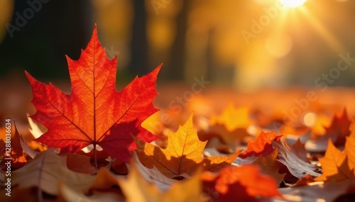 Fototapeta premium Close-up shot, pile of maple leaves, warm sunlight , orange, light