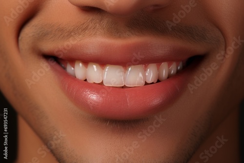 © okfoto, Fototapeta premium Close up shot smiling mixed race male lips, perfect white teeth, dental care concept.