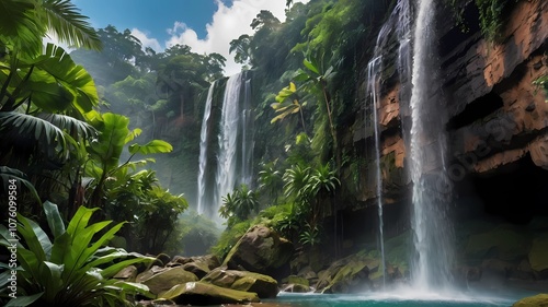 Fototapeta premium Close up shot, very detailed the Big Drop of water, wonderful tropics place waterfall on background