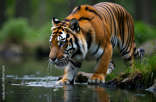 © Elena Verba, Naklejka premium Close up Siberian or Amur tiger drinking water from lake. Blurred background, selective focus.