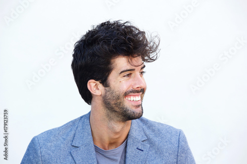 Fototapeta premium Close up side portrait of happy man in blazer