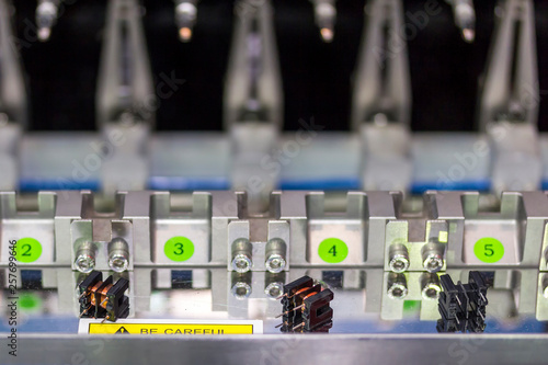 © Surasak, Obraz premium Close up small electric transformer at high precision and accuracy of multiple automatic coil winding machine
