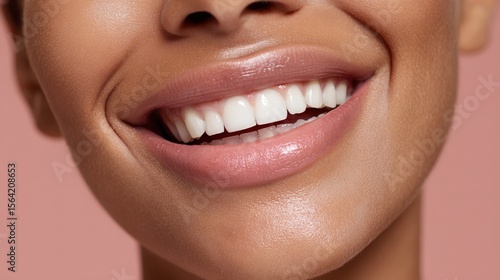 © Daphne, Fototapeta premium Close-up smiling face of young african female with perfect teeth on pink background