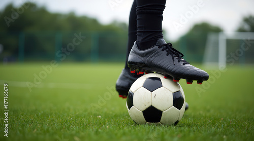 © Evgen, Obraz premium Close-up soccer scene showcasing player’s foot on ball